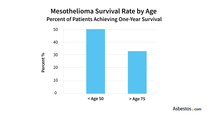 Younger patients have significantly higher mesothelioma survival rates than older patients. More than 50% of patients diagnosed before the age of 50 survive 1 year, while fewer than 33% of those 75 or older survive the same length of time.