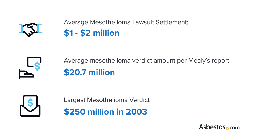 Mesothelioma settlements and verdicts can help cover medical bills, lost income and other related expenses.The average mesothelioma lawsuit settlement ranges from $1 million to $2 million. The average trial verdict ranges between $5 million to $20.7 million, according to the latest from Mealey’s.